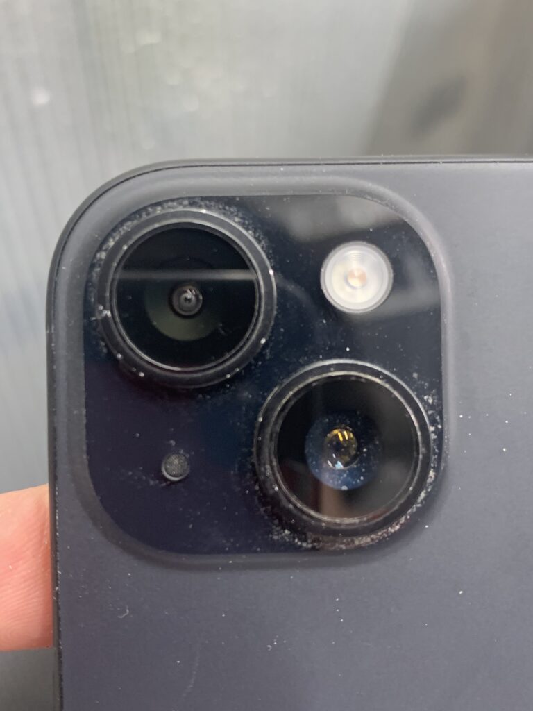 こちらのiPhoneも例外ではなく、ご覧のように右側のレンズが割れて大きく穴が開いていますね。
